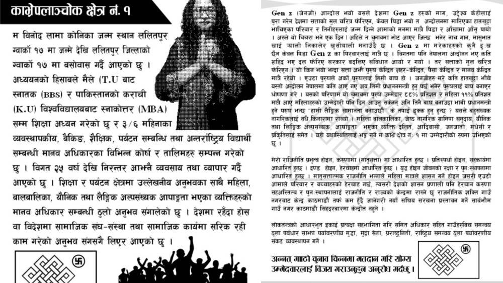 काभ्रेपलान्चोक – काभ्रेपलान्चोक क्षेत्र नम्बर १ बाट प्रतिनिधि सभा सदस्यका लागि विनोद लामा (कोनिका) चुनावी मैदानमा उत्रिएका छन्। लामो समयदेखि सामाजिक, मानवअधिकार र व्यावसायिक क्षेत्रमा सक्रिय उनी आफ्नो उम्मेदवारीलाई परम्परागत सत्ता संरचनाविरुद्धको वैकल्पिक राजनीतिक पहलका रूपमा प्रस्तुत गर्दै चुनावी सङ्घर्षमा होमिएकी छन्। ललितपुर महानगरपालिका–१७ ग्वार्कोमा जन्मिएर त्यहीँ हुर्किएका कोनिका हालसम्म पनि सोही स्थानमा बसोबास...