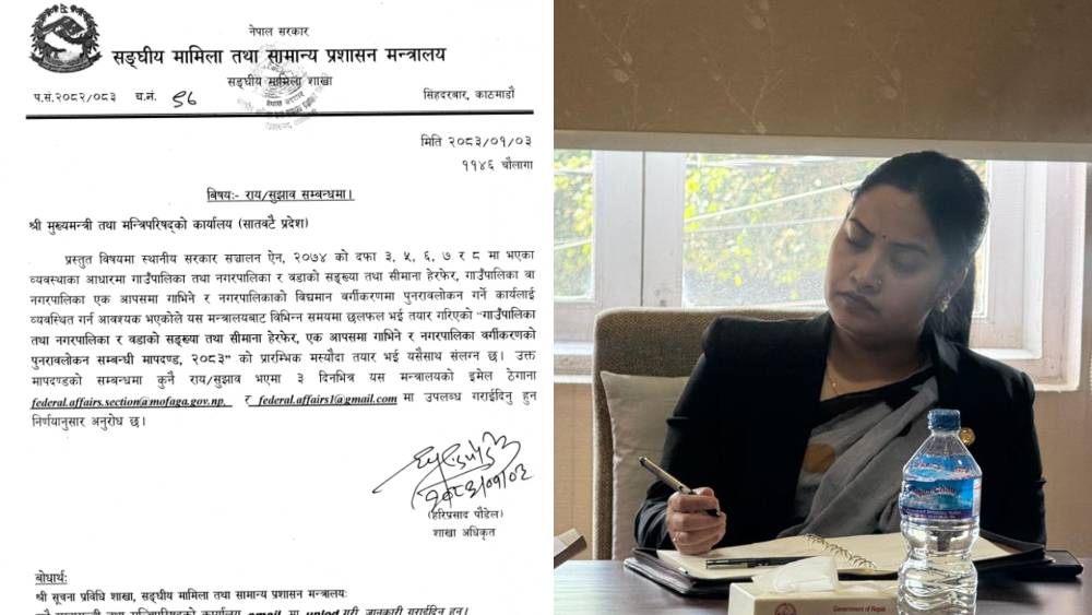काठमाडौं – गाउँपालिका, नगरपालिका तथा वडाको संख्या तथा सीमा हेरफेरबारे सङ्घीय मामिला तथा सामान्य प्रशासन मन्त्रालयले राय तथा सुझाव मागेको छ। मन्त्रालयले वैशाख ३...