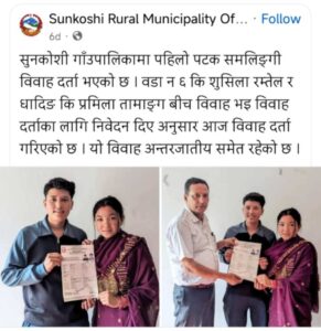 सुनकोशी गाउँपालिकाले गाउँपालिकामा पहिलो पटक समलिङ्गी विवाह दर्ता भएको छ। यो विवाह अन्तरजातीय समेत रहेको छ,फेसबुक पेजमा लेखेको छ। समलिङ्गी, तेस्रोलिंगी र अन्तरलिंगी जोडीको सहज रूपमा विवाह दर्ता हुने कानुन भने निर्माण भएको छैन।