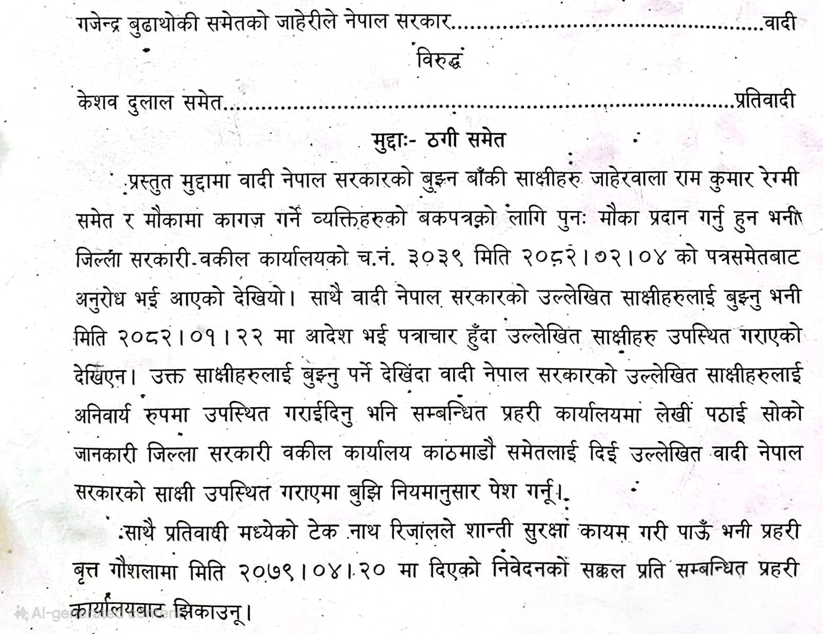 जिल्ला अदालतले तेस्रो पटक दिएको घटना विवरण कागज र बकपत्र गराउने (साक्षी बुझ्ने) आदेश दिएको छ। सरकारी वकिल कार्यालयले मुख्य उजुरीकर्ता गजेन्द्र बुढाथोकी, रामकुमार रेग्मी सहित उजुरीकर्ताको घटना विवरण कागज र बकपत्र भइसकेको अदालत प्रशासनले जनाएको छ।