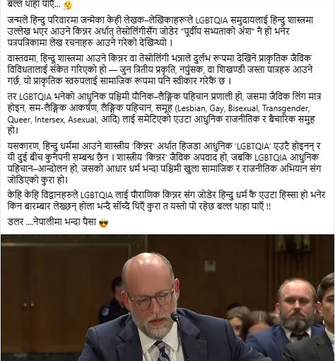 कसैले लेखेको थियो–किन्नर हाम्रो सभ्यताको हिस्सा हुन्, त्यसैलेLGBTQIA पनि हिन्दु परम्परा भित्रकै एक रूप हो। सुनिँदा सहिष्णु लागे पनि, बुझ्दा भ्रमपूर्ण।