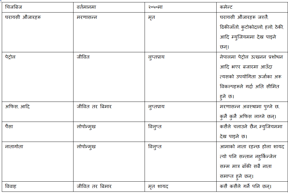 हामी कस्तो समयमा बाँच्दै छौँ र अगाडि जीवन झन् कस्तो हुने छ। आउँदा दिनहरूमा हामीले देखेका, गरेका, भोगेका, उचित–अनुचित, सही–गलत छुट्टाएका धेरै कुराहरू अब त्यस्तै हुने छैनन्। ती मध्ये कतिपयका स्वरूप परिवर्तन हुने छन् भने कतिपय त लोप भएर जाने छन्। म २००८ सालको पुरानो पुस्ताको मान्छे। मेरो दृष्टिले हाम्रो पुस्तासँग सुपरिचित केही महत्त्वपूर्ण कुराहरू लोप भइरहेको देखिरहेको छ। पृथ्वीबाट विभिन्न वनस्पतिहरू, जीवजन्तुहरू लोप भइरहेका छन् र उनको संरक्षणका लागि विभिन्न प्रयास पनि भइरहेका छन्। पर्यावरण विनाशको वर्णन विश्लेषण, समाधान आदि आदि पर्याप्त मात्रामा उपलब्ध छन्। म यहाँ यस्ता लोपोन्मुख कुराहरूको चर्चा गर्दै छु जसको संरक्षणका लागि कुनै प्रयास गरिएको छैन, र शायद गर्न सम्भव पनि छैन। किनभने यी मानव कल्याणका लागि मानवद्वारा नै निर्मित भएका हुन्।