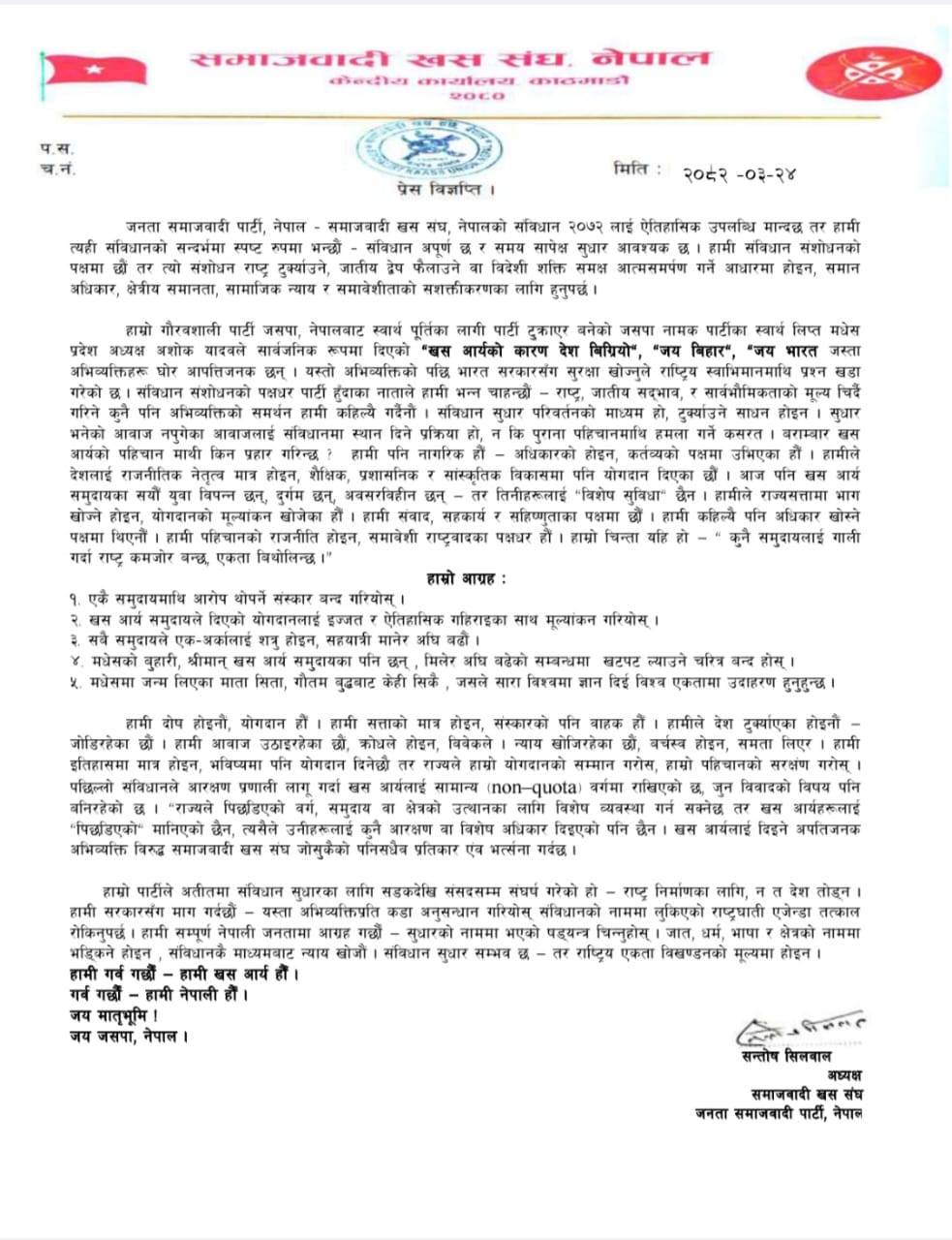 समाजवादी खस सङ्घले सबै नेपाली जनतालाई जात, धर्म, भाषा वा क्षेत्रका आधारमा भड्किन नदिन आह्वान गर्दै संविधान सुधार सम्भव छ, तर त्यो राष्ट्रिय एकता र सार्वभौमिकताको मूल्यमा हुन सक्दैन, भनेको छ।