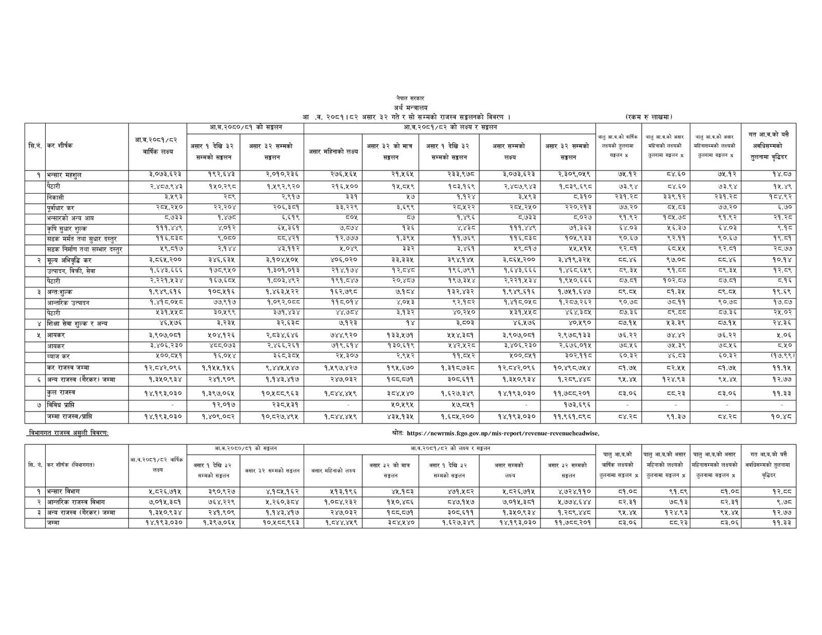 आर्थिक वर्ष २०८१/०८२ मा १४ खर्ब १९ अर्ब राजस्व सङ्कलन गर्ने लक्ष्य थियो। अर्ध वार्षिक समीक्षामा संशोधन गरी १२ खर्ब ८६ अर्बको लक्ष्य तय गरिएको थियो।