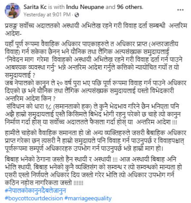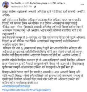 मितिनी नेपालकी कार्यकारी निर्देशक सरिता केसीले सामाजिक सञ्जाल फेसबुकमा यस्तो लेखेकी थिइन,“पूर्ण रूपमा वैवाहिक अधिकार पाएका (अन्तरजातीय विवाह गर्नेहरू) ले पनि अधिकार प्राप्त गर्न सकेका छैनन् भने, यौनिक तथा लैङ्गिक अल्पसङ्ख्यक समुदायलाई ‘निवेदन माग गरेमा विवाहको अस्थायी अभिलेख रहने गरी विवाह दर्ता गर्न पाउने व्यवस्था गर्नु’ भन्ने अन्तरिम आदेशले कत्तिको न्याय गर्छ त यो समुदायलाई?”