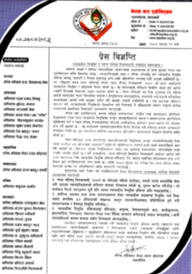 काठमाडौँ —नेपाल बार एसोसिएसनले न्याय परिषद् नियमावली, २०७४ को पहिलो संशोधन तत्काल खारेज गर्न माग गरेको छ।