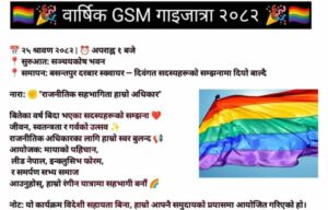 काठमाडौं – “राजनीतिक सहभागिता हाम्रो अधिकार” भन्ने नारासहित आइतबार दिउँसो १ बजे काठमाडौँको सञ्चयकोष भवन, ठमेलबाट इन्द्रेणी गाईजात्रा र्याली सुरु हुँदैछ। र्यालीमा सहभागी हुन आयोजकहरूले लैङ्गिक तथा यौनिक अल्पसङ्ख्यक सबैलाई आह्वान गरेका छन्।
