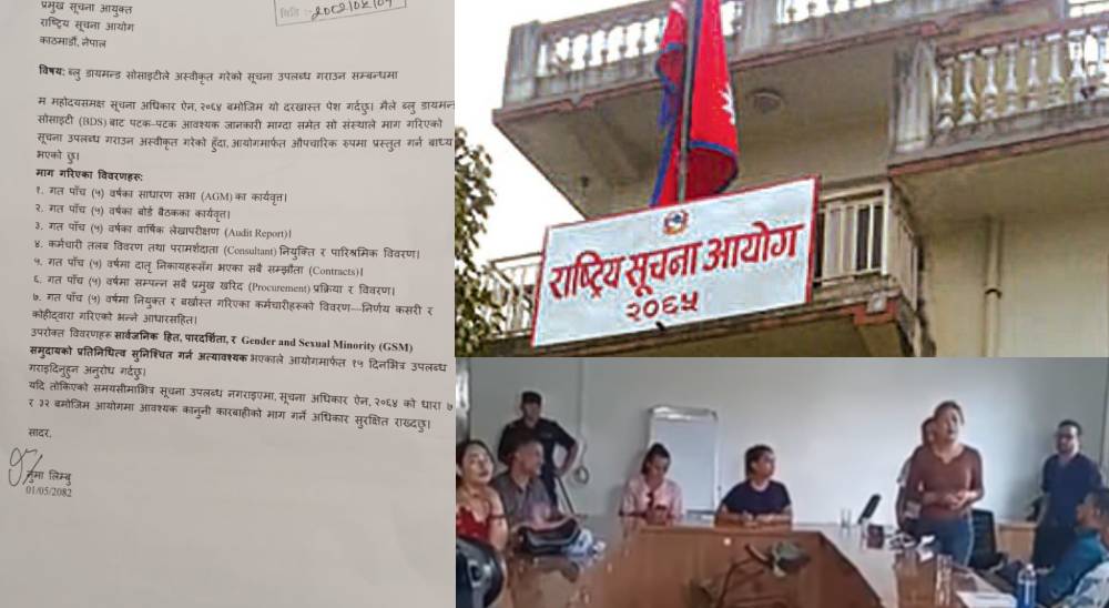 ब्लु डायमन्ड सोसाइटीमा एचआइभी परियोजनामा काम गरिसकेकी पूर्वकर्मचारी तथा अधिकारकर्मी नुमा लिम्बु (चञ्चला)ले साउन १५ गते दोस्रो पटक इमेल गरेर आवश्यक सूचना मागेको जानकारी दिएकी छन्। जिल्ला प्रशासन कार्यालय काठमाडौँले यसअघि छलफल बोलाए पनि माग गरिएका सूचना उपलब्ध नगरिएको उनले बताइन्।
