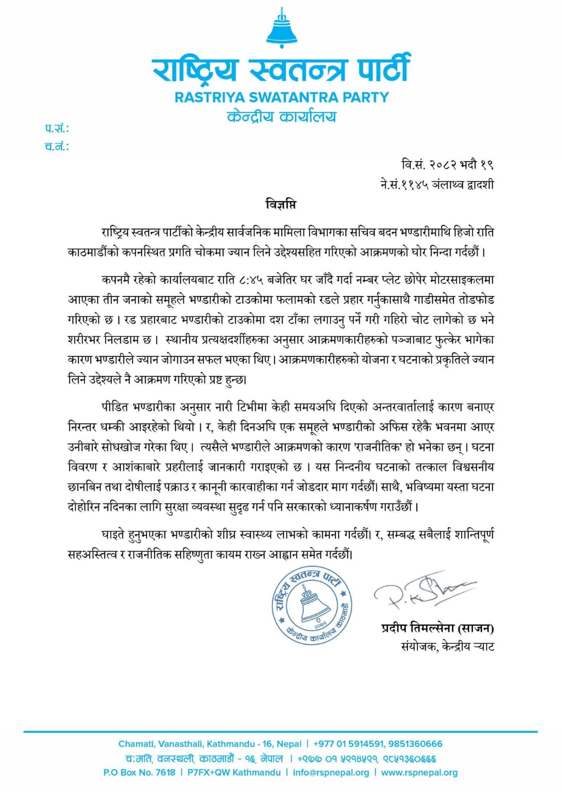 रास्वपाका केन्द्रीय सार्वजनिक मामिला विभागका सचिव बदन भण्डारीमाथि बुधवार राति आक्रमण भएको पार्टीले जनाएको छ।