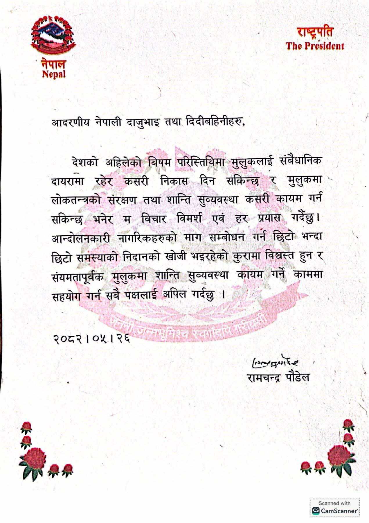 राष्ट्रपति पौडेलले बेलुकी ६ बजे प्रधानमन्त्री ओलीको राजीनामा स्वीकृत भएको पत्र सार्वजनिक गर्दै शान्तिपूर्ण समाधानको आग्रह गरे। उनले आन्दोलनकारी नागरिकसहित सबैलाई संयमित रहन, वार्तामार्फत माग सम्बोधन गर्न र लोकतन्त्रलाई सुरक्षित राख्न अपिल गरे। तर, राष्ट्रपतिको विज्ञप्तिमा रिक्त प्रधानमन्त्रीको विकल्पबारे केही उल्लेख नभएपछि शङ्का उब्जियो।