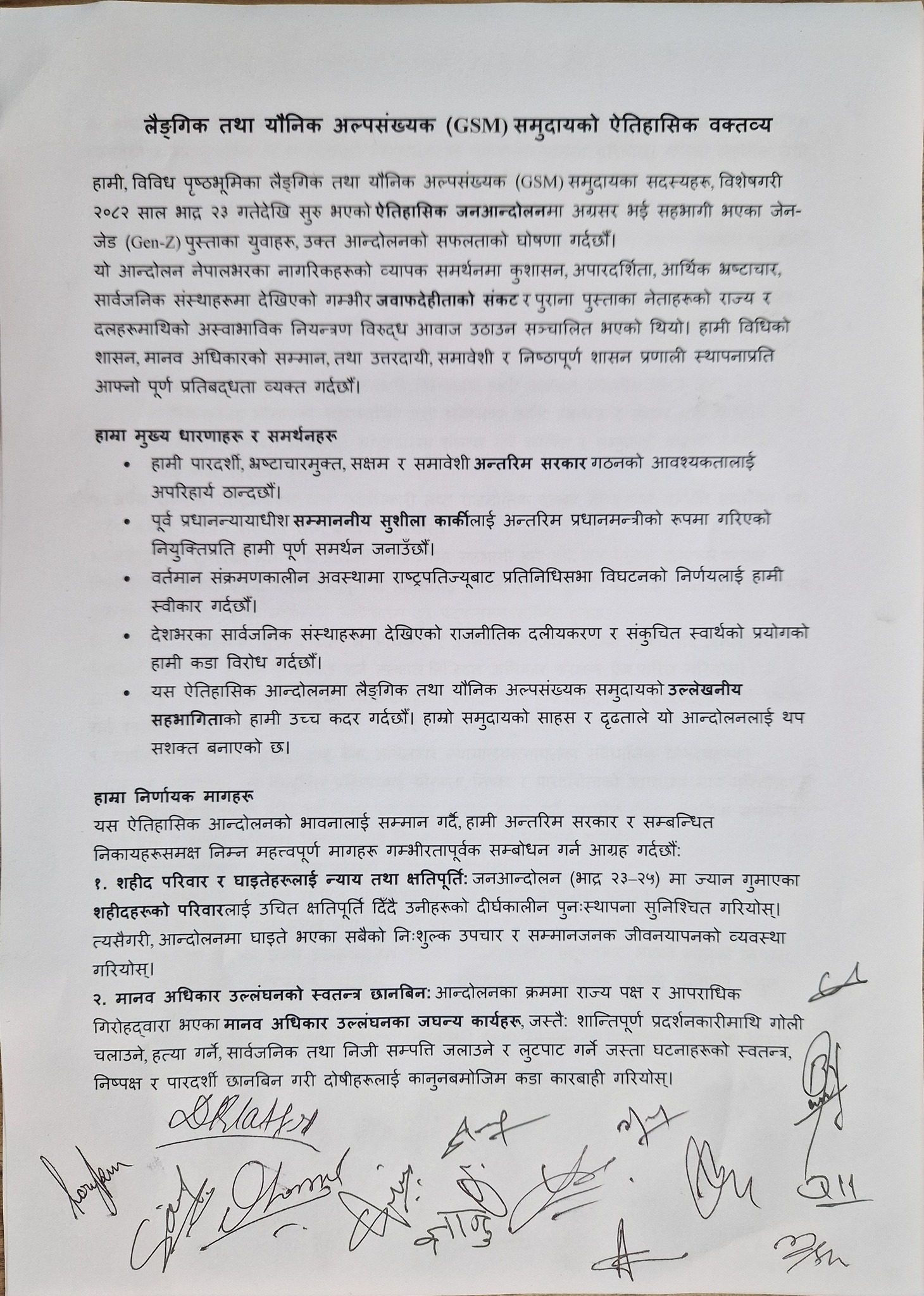 विविध पृष्ठभूमिका लैङ्गिक तथा यौनिक अल्पसङ्ख्यक समुदायका सदस्यहरू, विशेषगरी २०८२ साल भाद्र २३ गतेदेखि सुरु भएको ऐतिहासिक जनआन्दोलनमा अग्रसर भई सहभागी भएका जेनजी पुस्ताका युवाहरूले उक्त आन्दोलनको सफलताको घोषणा गरेका छन्।