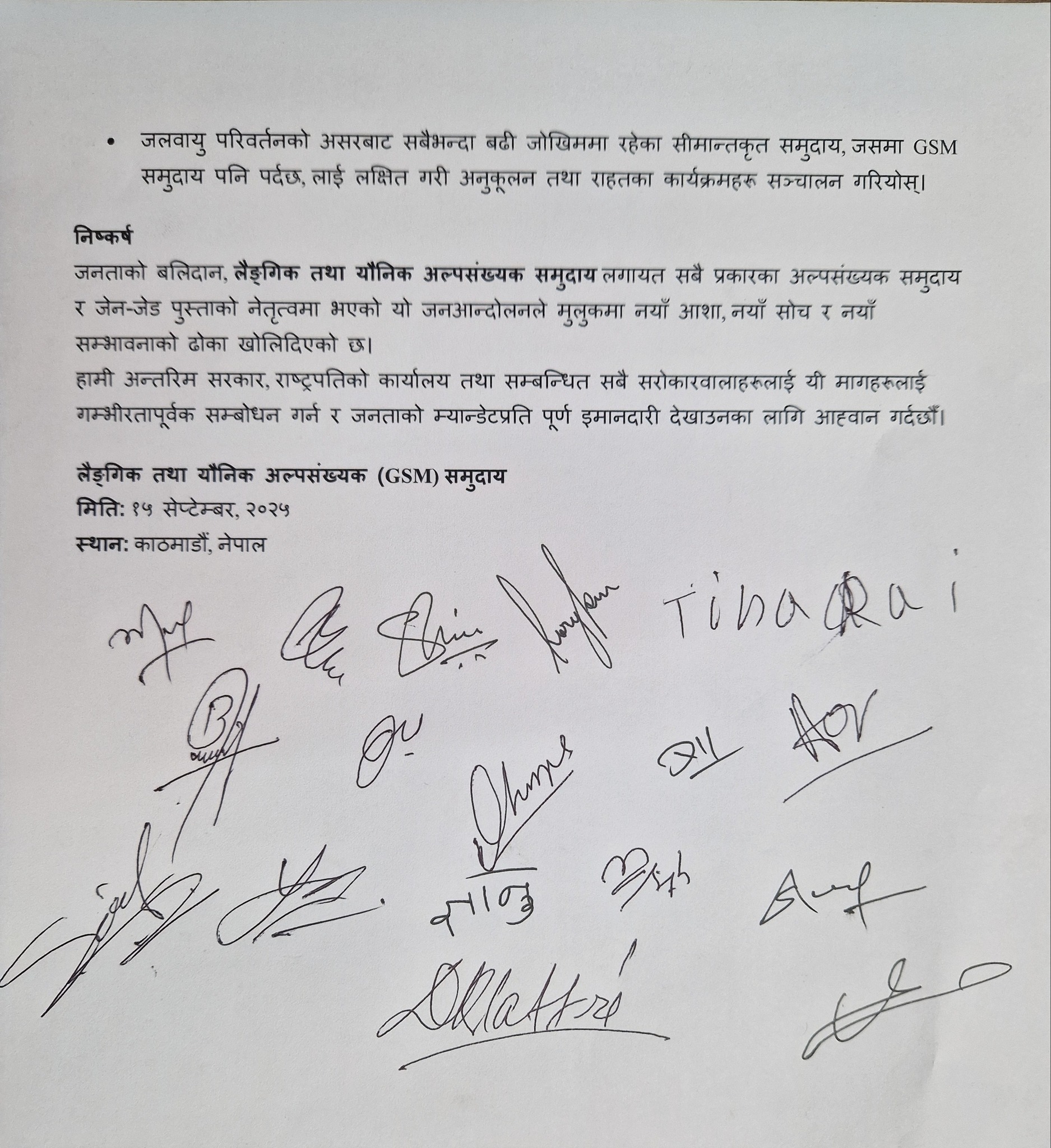 जनताको बलिदान, लैङ्गिक तथा यौनिक अल्पसङ्ख्यक समुदाय लगायत सबै प्रकारका अल्पसङ्ख्यक समुदाय र जेनजी पुस्ताको नेतृत्वमा भएको यो जनआन्दोलनले मुलुकमा नयाँ आशा, नयाँ सोच र नयाँ सम्भावनाको ढोका खोलिदिएको निष्कर्ष भेलाले निकालेको छ।