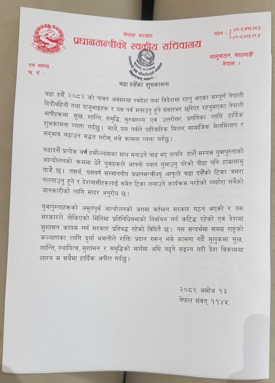 “बडादशैं प्रत्येक वर्ष हर्षोल्लासका साथ मनाइने चाड भए तापनि, हालै सम्पन्न युवापुस्ताको आन्दोलनको क्रममा धेरै युवाहरूले आफ्नो ज्यान गुमाउनु परेको पीडा हाम्रासामु ताजै छ। तसर्थ यस वर्ष प्रधानमन्त्रीले आफूले बडादशैंको टिका–जमरा नलगाउने र देशबासीलाई समेत टिका लगाउने कार्यक्रम नरहेको व्यहोरा सबैको जानकारीका लागि सादर अनुरोध गरिएको छ,” शुभकामना सन्देशमा उल्लेख छ।