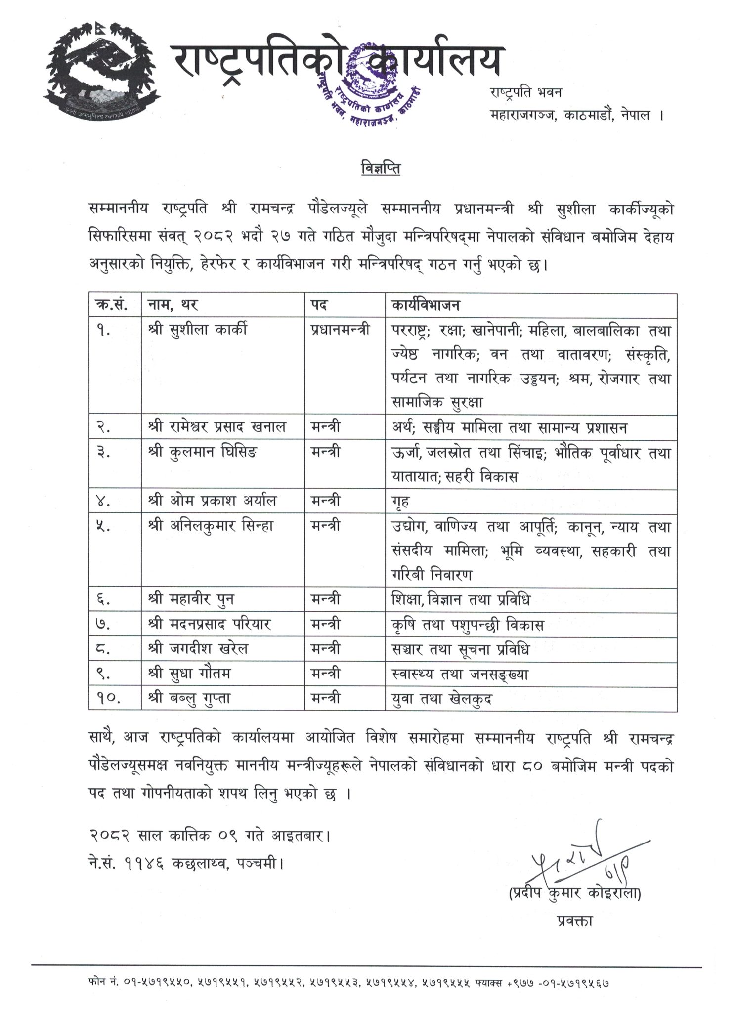 प्रधानमन्त्री कार्कीको मन्त्रिपरिषद् अब १० सदस्यीय बनेको छ। उनले आइतबार स्वास्थ्य तथा जनसङ्ख्या मन्त्रीमा पूर्वसचिव डा. सुधा शर्मा गौतम र युवा तथा खेलकुद मन्त्रीमा बब्लु गुप्तालाई नियुक्त गरेकी हुन्।