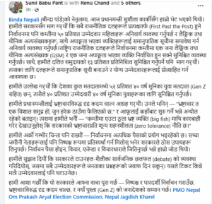 पहिलो संविधानसभाका चार सभासद्को टोली डा. बिन्दा पाण्डे, रेणु चन्द, अमृता थापा मगर र सुनिल बाबु पन्तले प्रधानमन्त्री कार्कीसँग निर्वाचन कानुनमा प्रत्यक्ष प्रणालीमै ५० प्रतिशत महिला उम्मेदवार अनिवार्य गर्न माग गर्यो।