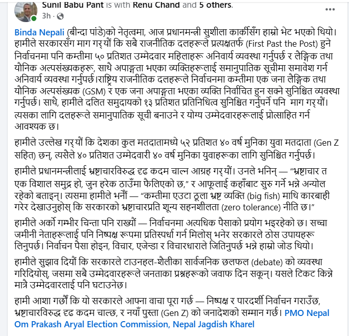 प्रधानमन्त्रीसँगको भेटपछि पन्तले सामाजिक सञ्जालमा लेखेका छन्, यो सरकारले आफ्ना वाचा पूरा गर्छ – निष्पक्ष र पारदर्शी निर्वाचन गराउँछ, भ्रष्टाचारविरुद्ध दृढ कदम चाल्छ, र नयाँ पुस्ता जेनजीको जनादेशको सम्मान गर्छ।