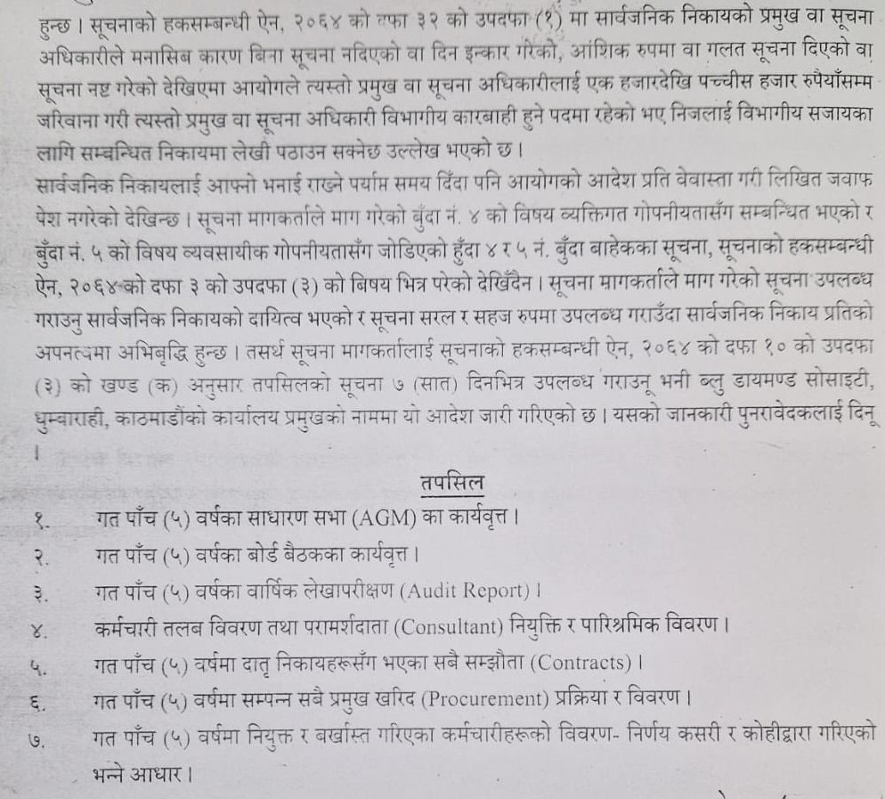 सूचना आयोगको आदेश अनुसार ब्लु डायमन्डले गत पाँच वर्षको साधारण सभा र बोर्ड बैठकका कार्यवृत्त, वार्षिक लेखापरीक्षण प्रतिवेदन, कर्मचारी तलब तथा परामर्शदाता नियुक्ति र पारिश्रमिक विवरण, दातृ निकायसँग भएका सम्झौता, प्रमुख खरिद प्रक्रिया र त्यसका विवरण उपलब्ध गराउनुपर्नेछ। साथै, सो अवधिमा नियुक्त र बर्खास्त गरिएका कर्मचारीको निर्णय कसरी र कसको आदेशमा भएको भन्ने आधार समेत पेस गर्न निर्देशन दिएको छ।