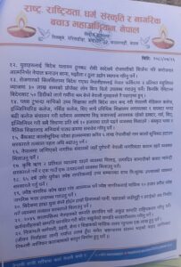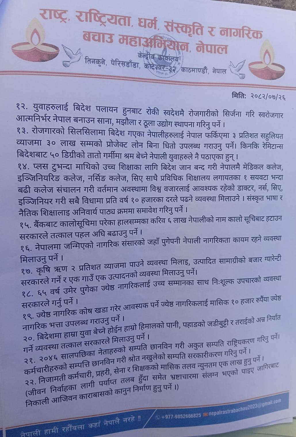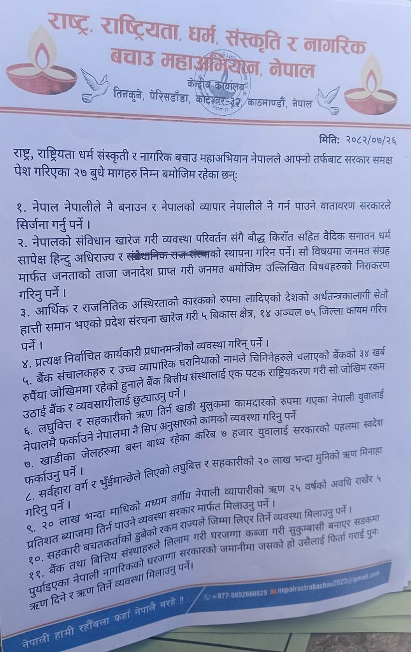 मुलुकको जर्जर अवस्थालाई मध्यनजर गर्दै महाअभियान–नेपालले विगत तीन वर्षदेखि देशमा मौलाउँदै गएको चरम भ्रष्टाचार, कुशासन, वित्तीय अराजकता र राजनीतिक अस्थिरता विरुद्ध सडकबाट प्रतिपक्षको भूमिका निर्वाह गर्दै नागरिकको रक्षार्थ आफ्ना जायज मागहरू अघि सारेको र शान्तिपूर्ण आन्दोलनमार्फत सरकारलाई खबरदारी गर्दै आएको गृहमन्त्रीलाई जानकारी गराएको छ।