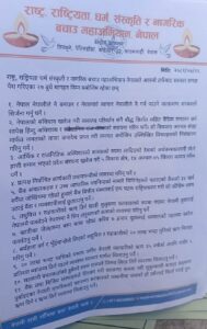 काठमाडौँ – राष्ट्र, राष्ट्रियता, धर्म, संस्कृति र नागरिक बचाउ महाअभियान–नेपालका प्रतिनिधिले गृहमन्त्री ओमप्रकाश अर्यालसँग वार्ता गरेका छन्। जिल्ला प्रशासन कार्यालय, काठमाडौँको पत्रका आधारमा वार्तामा गएको महाअभियानका प्रतिनिधिले सरकारसमक्ष विभिन्न २७ बुँदे माग पेस गरेका छन्।