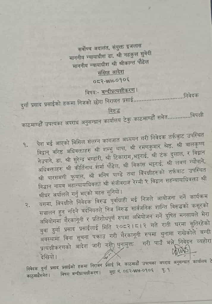 निवेदन दर्ता भएको भोलिपल्ट गत बिहीबार सुनुवाइ गर्दै सर्वोच्चले २४ घण्टाभित्र प्रसाईँलाई उपस्थित गराउन आदेश गरेको थियो। त्यसअनुसार प्रहरीले आइतबार उनलाई अदालतमा पेस गरेको थियो।