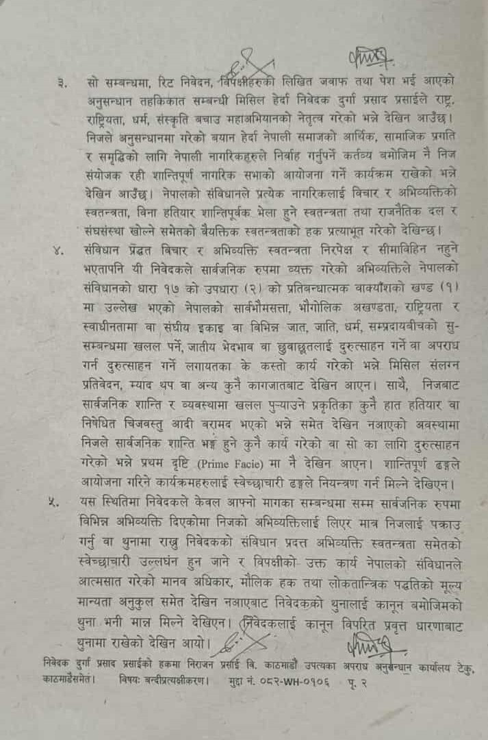 सर्वोच्चको आदेशमा भनिएको छ, नेपालको संविधानले प्रत्येक नागरिकलाई विचार र अभिव्यक्तिको स्वतन्त्रता, बिना हतियार शान्तिपूर्वक भेला हुने स्वतन्त्रता र राजनैतिक दल तथा सङ्घ–संस्था खोल्ने अधिकारसहित वैयक्तिक स्वतन्त्रता प्रत्याभूत गरेको देखिन्छ। विचार र अभिव्यक्ति स्वतन्त्रता निरपेक्ष नहुने भए पनि निवेदकले सार्वजनिक रूपमा व्यक्त गरेका अभिव्यक्तिले नेपालको संविधानको धारा १७ को उपधारा (२) को प्रतिबन्धात्मक खण्ड (१) ले तोकेको सार्वभौमसत्ता, भौगोलिक अखण्डता, राष्ट्रियता, स्वाधीनता, सङ्घीय इकाई तथा जातजाति, धर्म, सम्प्रदायबीचको सम्बन्धमा खलल पुर्याउने कुनै कार्य गरेको देखिने प्रमाण मिसिल, प्रतिवेदन वा कुनै पनि कागजातबाट देखिएन।