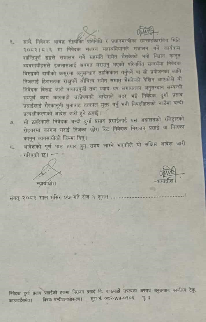त्यसैले प्रसाईँ विरुद्ध जारी भएको पक्राउ पुर्जी, म्याद थपसहित अनुसन्धानसम्बन्धी सबै कामकारबाही बदर भई, दुर्गा प्रसाद प्रसाईँलाई गैरकानुनी थुनाबाट तत्काल मुक्त गर्न विपक्षीको नाममा बन्दी प्रत्यक्षीकरणको आदेश जारी भएको अदालतले जनाएको छ।