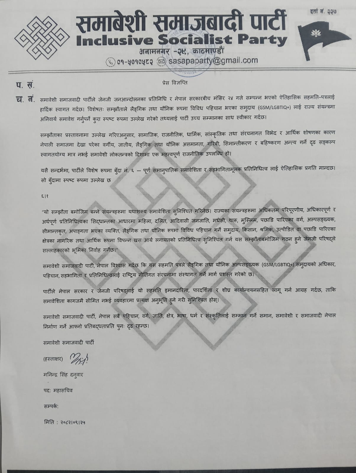 महासचिव मनिन्द्र सिंह दनुवारले निकालेको निकालेको विज्ञप्तिमा समाजमा विद्यमान वर्गीय, जातीय, लैङ्गिक तथा यौनिक असमानता, गरिबी, सिमान्तीकरण र बहिष्करण अन्त्य गर्ने सहमतिमा व्यक्त दृढ सङ्कल्प समावेशी लोकतन्त्रको दिशामा महत्त्वपूर्ण राजनीतिक उपलब्धि भएको उल्लेख गरिएको छ।