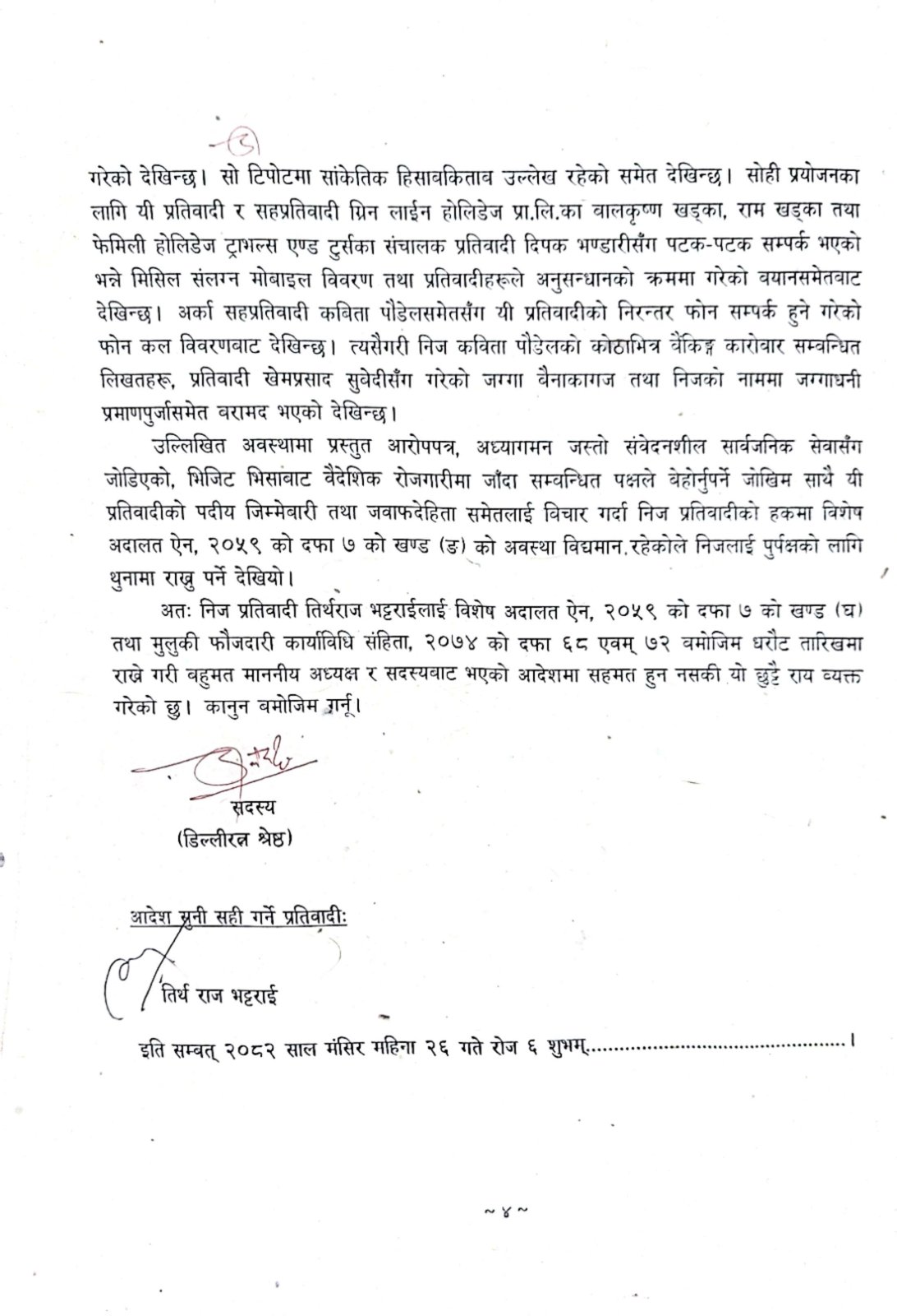 उनले विशेष अदालत ऐन २०५९ को दफा ७ खण्ड (घ) तथा मुलुकी फौजदारी कार्यविधि संहिता २०७४ को दफा ६८ र ७२ बमोजिम धरौटी तारिखमा राख्नुपर्ने आदेशमा सहमत हुन नसकी छुट्टै राय राखेको लेखिएको छ। तिर्थराज भट्टराईले आदेश सुनेर सही गरेका छन्।