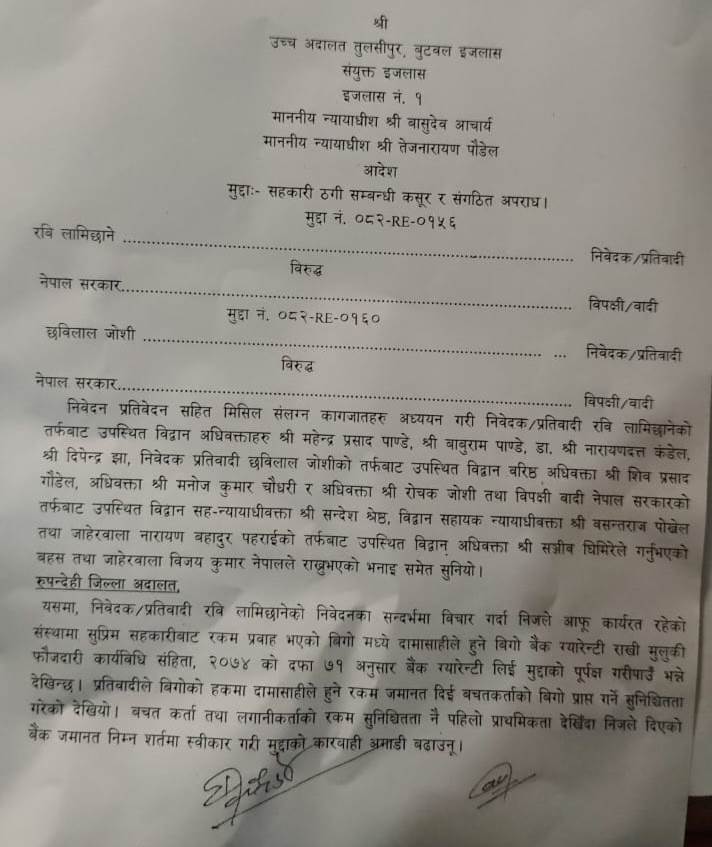 तुलसीपुर उच्च अदालतको १ नम्बर बुटवल इजलासमा आज लामिछाने र तत्कालीन गोर्खा मिडियाका सञ्चालक तथा पूर्व डिआइजी छविलाल जोशीको मुद्दामा अन्तिम सुनुवाइ भएको थियो। बुटवलस्थित सुप्रिम सहकारी संस्थाको रकम ठगी तथा सङ्गठित अपराध अभियोगमा उनीहरू थुनामा थिए।