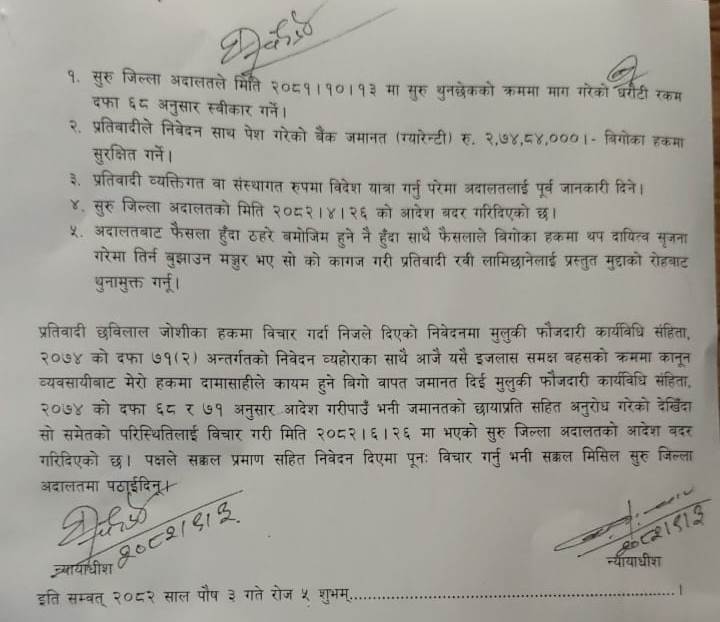 लामिछानेलाई विदेश यात्रामा भने रोक लगाइएको छ। आदेश अनुसार व्यक्तिगत वा संस्थागत रूपमा विदेश यात्रा गर्नुपरेमा अदालतलाई पूर्व जानकारी दिनुपर्नेछ। फैसलाले बिगोका हकमा थप दायित्व सृजना गरेमा तिर्न–बुझाउन मन्जुर भएको कागज गरी प्रतिवादी लामिछानेलाई प्रस्तुत मुद्दाको रोहबाट थुनामुक्त गर्ने आदेश गरिएको छ।