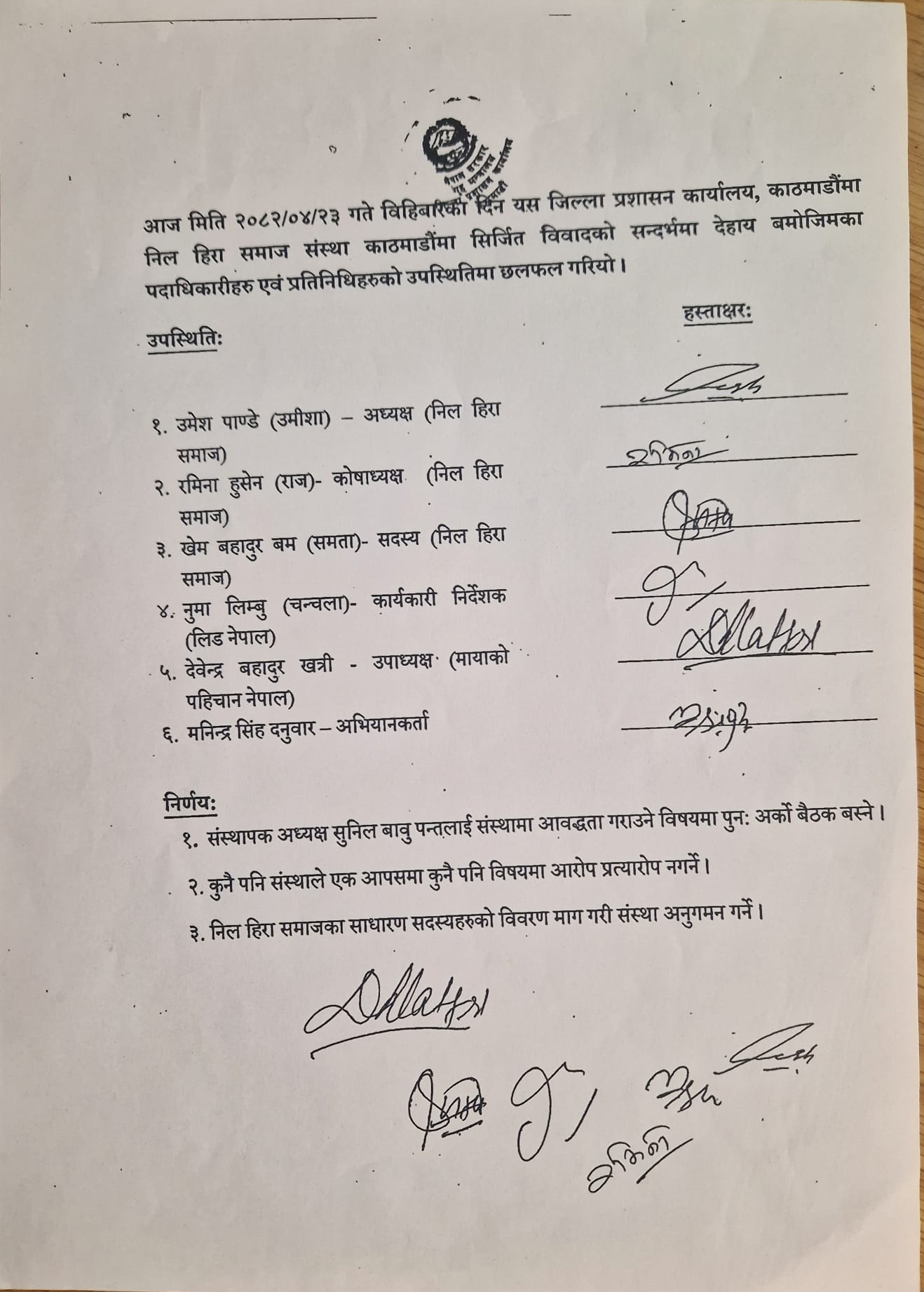 उजुरीपछि जिल्ला प्रशासन कार्यालयले २०८२ साउन २३ गते दुवै पक्षलाई बोलाएर छलफल गराएको थियो। संस्थापक अध्यक्ष सुनिल बाबु पन्तलाई पुनः संस्थामा आबद्ध गराउने विषयमा अर्को बैठक बस्ने, आरोप–प्रत्यारोप नगर्ने र साधारण सदस्यहरूको विवरण माग गरी संस्था अनुगमन गर्ने तीन बुँदे निर्णय भएको थियो।