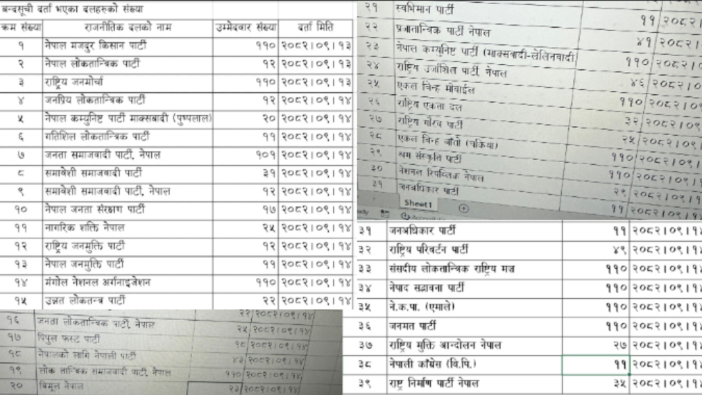 चुनावमा भाग लिने ११४ दलमध्ये समानुपातिक तर्फ भाग लिन दल दर्ता गराएका १ सय मध्ये अधिकांश दलले उम्मेदवारको बन्दसूची निर्वाचन आयोगमा पेश गरेका छन्।