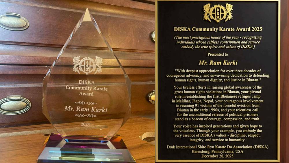 ह्यारिसबर्ग – भुटानका जेलमा रहेका राजनीतिक बन्दीहरूको रिहाइका लागि अन्तर्राष्ट्रिय वकालत गर्दै आएका मानवअधिकार अभियन्ता राम कार्की अमेरिकामा सम्मानित भएका छन्। कार्की सन् २०२५ को डिस्का कम्युनिटी कराते अवार्डबाट सम्मानित भएका हुन्।