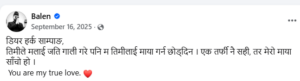 भदौ २३ र २४ गतेको जेनजी आन्दोलन लगत्तै बालेन र हर्कबीचको सम्बन्ध सार्वजनिक बहसमै पुगेको थियो। सोही क्रममा बालेनले सामाजिक सञ्जालमा हर्कलाई सम्बोधन गर्दै भावनात्मक स्ट्याटस लेखेका थिए, “डियर हर्क साम्पाङ, तिमीले मलाई जति गाली गरे पनि म तिमीलाई माया गर्न छोड्दिन। एकतर्फी नै सही, तर मेरो माया साँचो हो। यु आर माई ट्रियु लभ।”
