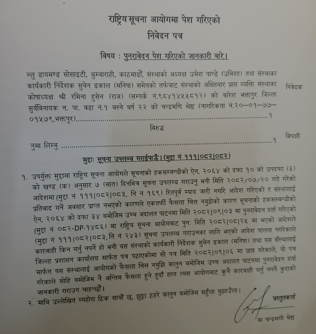 अख्तियार प्राप्त राजका वारेस चन्द्रमणि श्रेष्ठले राष्ट्रिय सूचना आयोगमा निवेदन पत्र पेस गरेका छन्। उक्त निवेदनमा राष्ट्रिय सूचना आयोगले सूचनाको हकसम्बन्धी ऐन, २०६४ को दफा १० को उपदफा (३) को खण्ड (क) अनुसार सात दिनभित्र सूचना उपलब्ध गराउन २०८२।०७।२० मा रीतपूर्वक म्याद जारी नगरी आदेश गरिएको दाबी गरिएको छ।