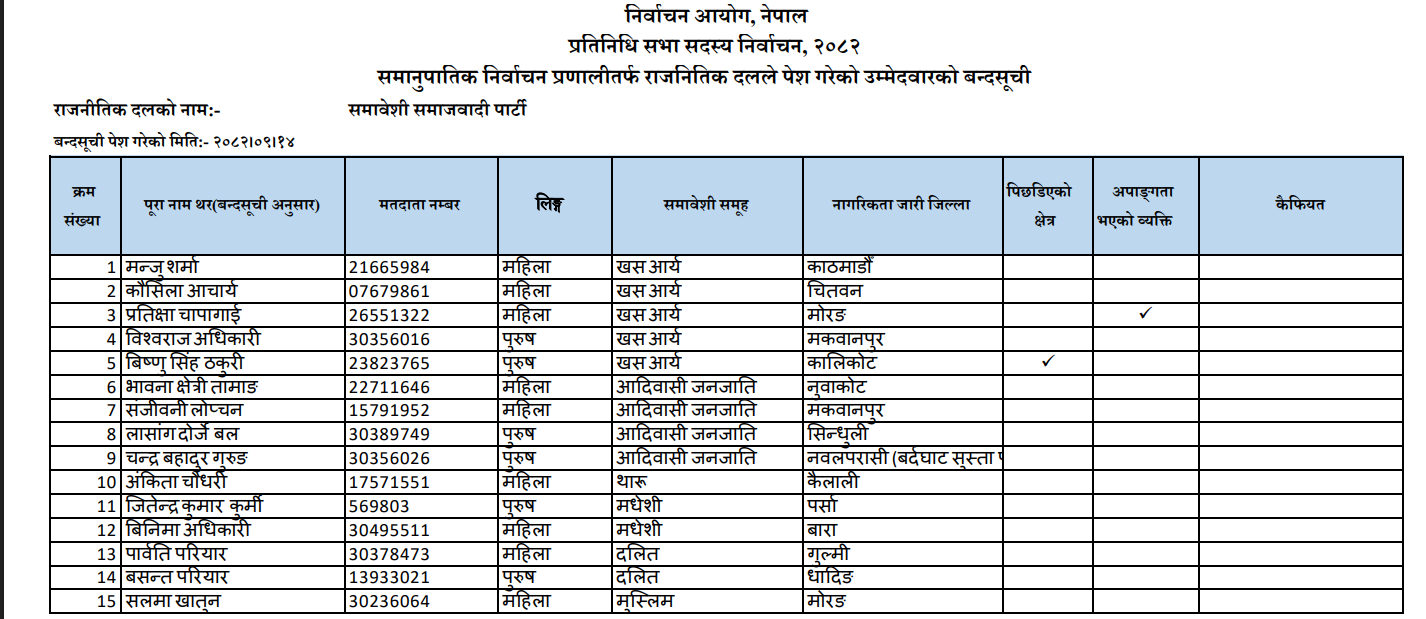 आयोगले समावेशी समाजवादी पार्टीसहित ६४ वटै राजनीतिक दलहरूको समानुपातिकतर्फका उम्मेदवारको बन्दसूची सार्वजनिक गरेको जनाएको छ।