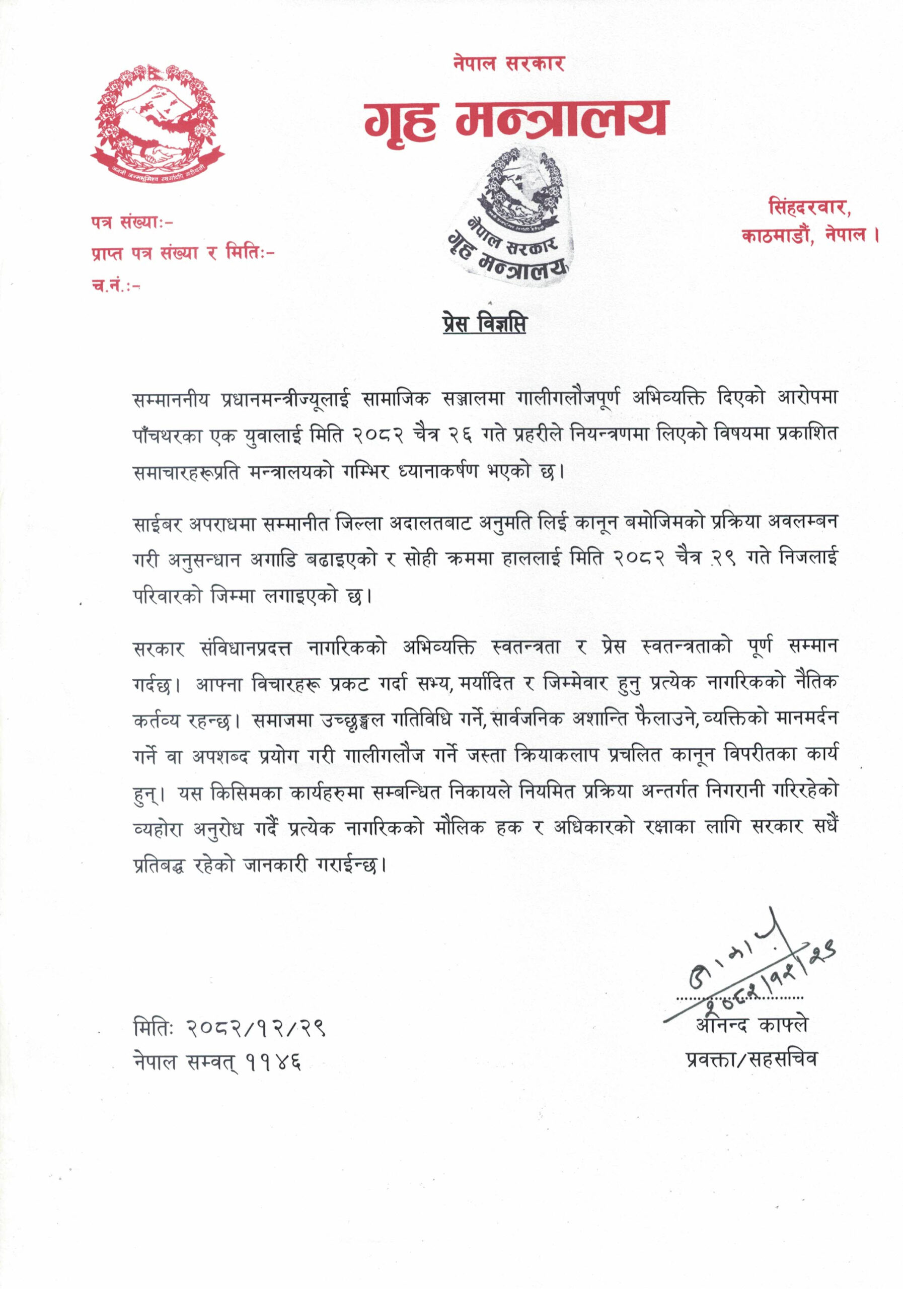 गृह मन्त्रालयले विज्ञप्ति जारी गर्दै प्रधानमन्त्रीलाई सामाजिक सञ्जालमा गालीगलौजपूर्ण अभिव्यक्ति दिएको आरोपमा पाँचथरका एक युवालाई प्रहरीले नियन्त्रणमा लिएको विषयमा प्रकाशित समाचारहरूप्रति मन्त्रालयको गम्भीर ध्यानाकर्षण भएको जनाएको छ।