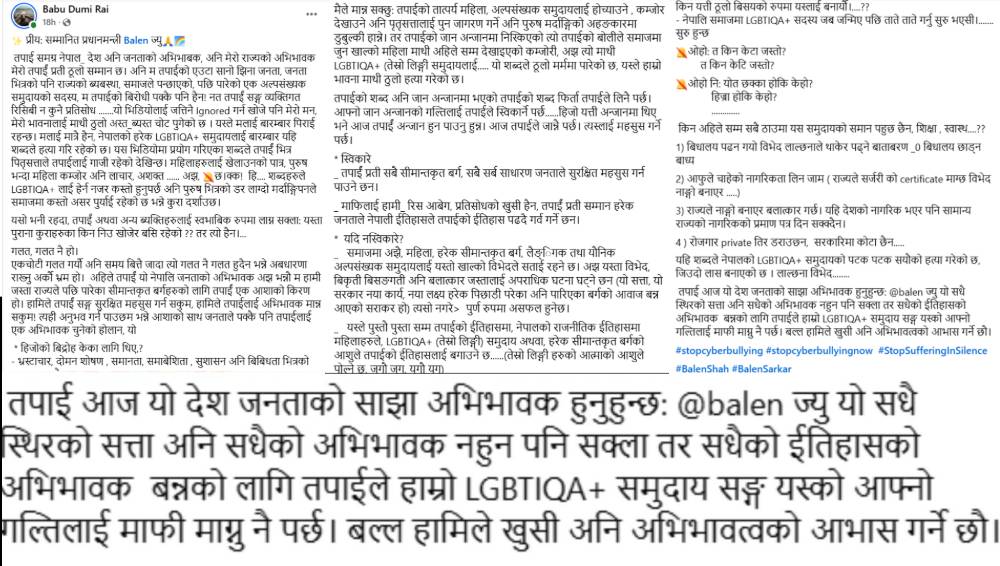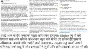 काठमाडौँ – लैङ्गिक तथा यौनिक अल्पसंख्यक समुदायका सदस्यले प्रधानमन्त्री वालेन्द्र शाह (वालेन)लाई विवादित भिडियो हटाउन खुला पत्र पठाएका छन्। भिडियोमा प्रयोग गरिएका शब्दप्रति आत्मस्वीकृति जनाउन विनम्र अनुरोध गरेका छन्।