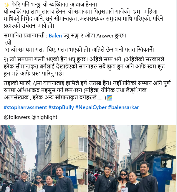 काठमाडौं – लैङ्गिक तथा यौनिक अल्पसंख्यक जेनजी युवा बाबु दुमि राईले प्रधानमन्त्री वालेन्द्र शाह (वालेन) विरुद्ध व्यक्तिगत आक्षेप नलगाएको स्पष्ट पारेका छन्। “फेरि पनि भन्छु, यो व्यक्तिगत आवाज होइन,” उनले सामाजिक सञ्जाल फेसबुकमा लेखेका छन्।