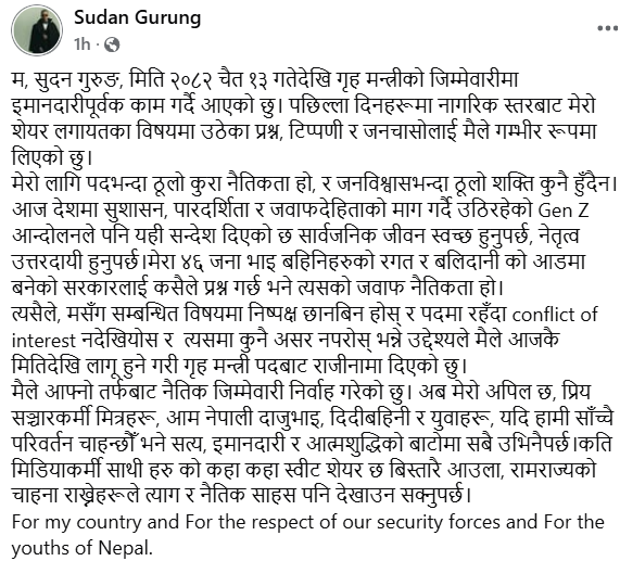पदमा रहँदा स्वार्थको द्वन्द्व (कन्फ्लिक्ट अफ इन्ट्रेस्ट) नदेखियोस् र त्यसमा कुनै असर नपरोस् भन्ने उद्देश्यले आजकै मितिदेखि लागू हुने गरी गृहमन्त्री पदबाट राजीनामा दिएको गुरुङले लेखेका छन्। उनले आफ्नो तर्फबाट नैतिक जिम्मेवारी निर्वाह गरेको दाबी गरेका छन्।