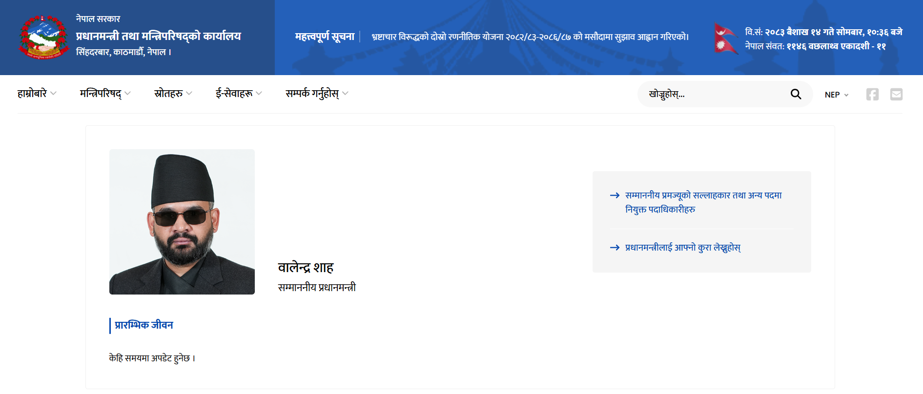 प्रधानमन्त्री तथा मन्त्रिपरिषद् कार्यालयको वेबसाइटमा १३ चैतमै ‘केही समयमा अपडेट हुने’ उल्लेख गरिएको प्रधानमन्त्री शाहको प्रारम्भिक जीवनसम्बन्धी विवरण एक महिना पूरा हुँदासम्म पनि उही अवस्थामै कायम छ। वेबसाइटमा अद्यावधिक हुने प्रतीक्षा अझै सकिएको छैन।
