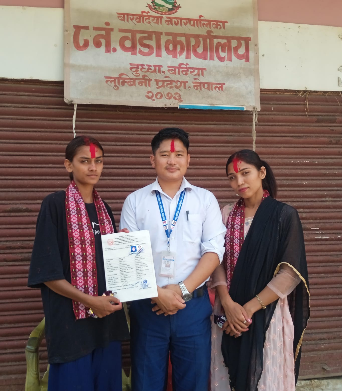 Madhu Sunar from Ward No. 4 of Basgadhi Municipality, Bardiya, and Rekha Bishwakarma from Bhagatpur, Ward No. 8 of Barbardiya Municipality, received an official marriage registration certificate.