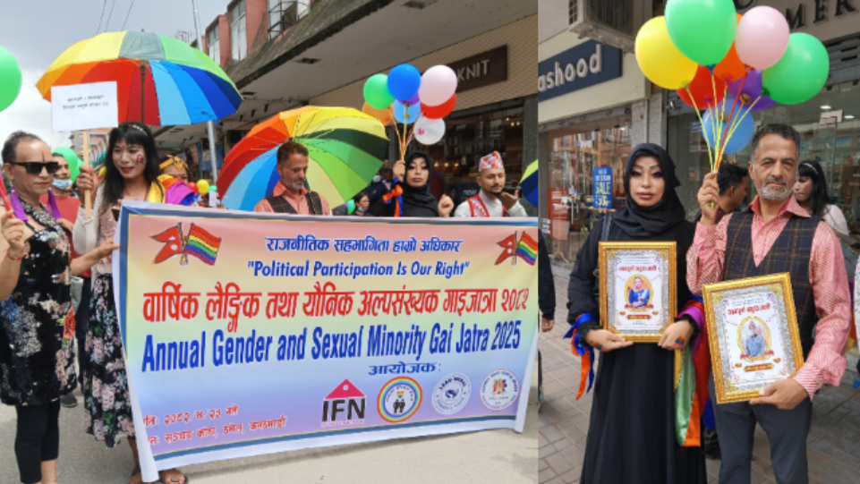 Kathmandu – Kathmandu’s streets were full of colour, music, and joy on Sunday as hundreds from Nepal’s gender and sexual minority (GSM/LGBTI) communities celebrated this year’s Indreni Gai Jatra. The event was lively but well-organised, mixing pride, remembrance, and political demands.
