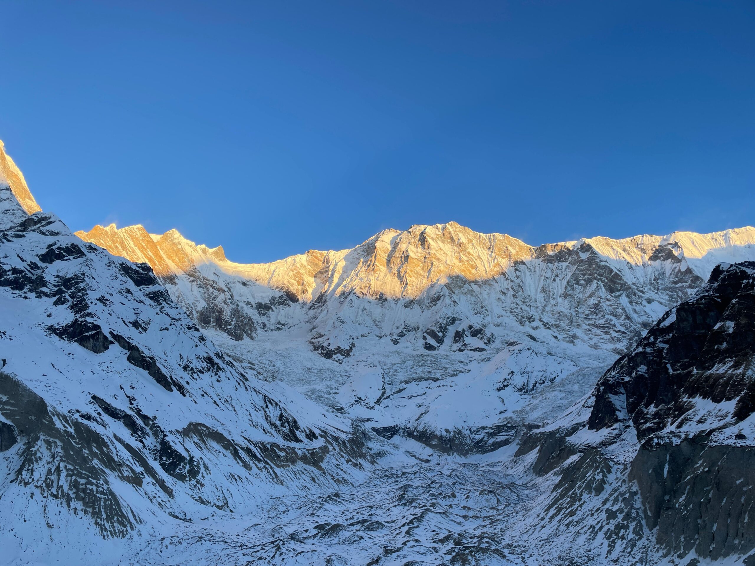 In mid September of 2024, As I took my first step from Nayapul, Baglung the dawning light from the mountain welcomed me to its lap. I was very excited taking the journey to the Annapurna Base Camp- sites at the base of Annapurna Region which is nestled between a large mountain range in the Himalayas that includes other prominent peaks such as Annapurna South, Annapurna I, Machhapuchre(Fishtail Mountain) and Hiunchuli. The Annapurna Basecamp trek had been a dream for years; Images of Snow-Capped Mountains and 360° Himalayan Ranges. Path full of lush Forests where the air was fresh and filled with the scent of pine and wildflowers, I passed by Friendly locals, Mostly farmers tending to their fields, and the professional goat herder leading their flock through the trails, with nature trail treks guiding me, This dream was finally turned into reality, As the sun dipped below the horizon, the mountains glowed with golden hues with the 360° Views of Annapurna Range As I reached at Annapurna Base Camp(ABC). The moment was so unreal and I couldn’t believe I was standing at the heart of the Annapurna Sanctuary.